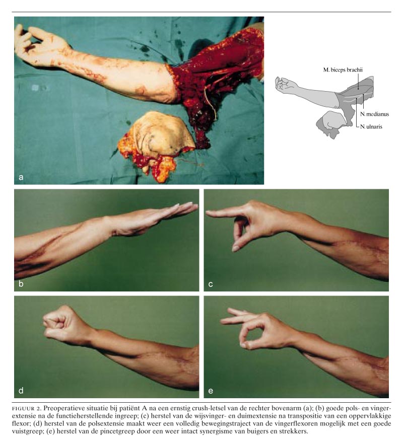 Bij patiënt A wordt door het uitvallen van de N. radialis en daarmee uitval van pols- en vingerextensie, het natuurlijke synergisme van buigers en strekkers verstoord. Hierdoor ontstaat een paradoxale vermindering van de grijpfunctie.1 Dit veroorzaakt belangrijke beperkingen bij vrijwel alle handelingen in het dagelijks leven. Door het opofferen van twee oppervlakkige flexoren, waarna vingerflexie door de diepe buigers goed mogelijk blijft, kunnen alle vingerextensoren inclusief de lange duimextensor weer worden geactiveerd.2 Herstel van de polsextensie door een transpositie naar de M. extensor carpi radialis brevis geeft polsstabiliteit en een beter bewegingstraject voor de vingerflexoren, waardoor een krachtige vuistgreep mogelijk wordt.2-4 Bij deze patiënte moesten wij afzien van de standaardtranspositie met de M. pronator teres omdat die was gedestrueerd en werd gekozen voor de radiale polsbuiger als motor. Hierbij wordt de belangrijkste polsbuiger, de M. flexor carpi ulnaris, gespaard voor stabiliteit en kracht. De stabiliteit van de duimbasis blijft na denervatie van de M. abductor pollicis longus gewaarborgd door tenodese van de pees hiervan aan de M. brachioradialis. Daardoor zijn geen additionele donors noodzakelijk.4 De elleboogextensie werd later hersteld, omdat patiënte in eerste instantie het verlies van elleboogfunctie als minder hinderlijk ervoer.