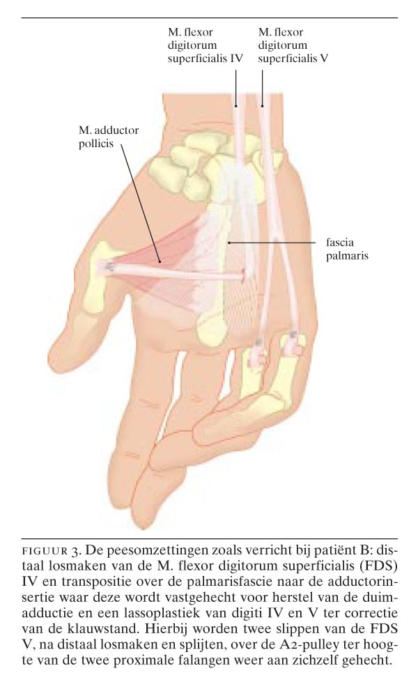 Bij patiënt werd een peestranspositie uitgevoerd van de oppervlakkige buiger van de pink over de fascia palmaris naar de duimadductor. Daarnaast werd een lassoplastiek volgens Zancolli van de ringvinger en de pink verricht met de gekliefde pees van de vijfde oppervlakkige buiger (figuur 3).