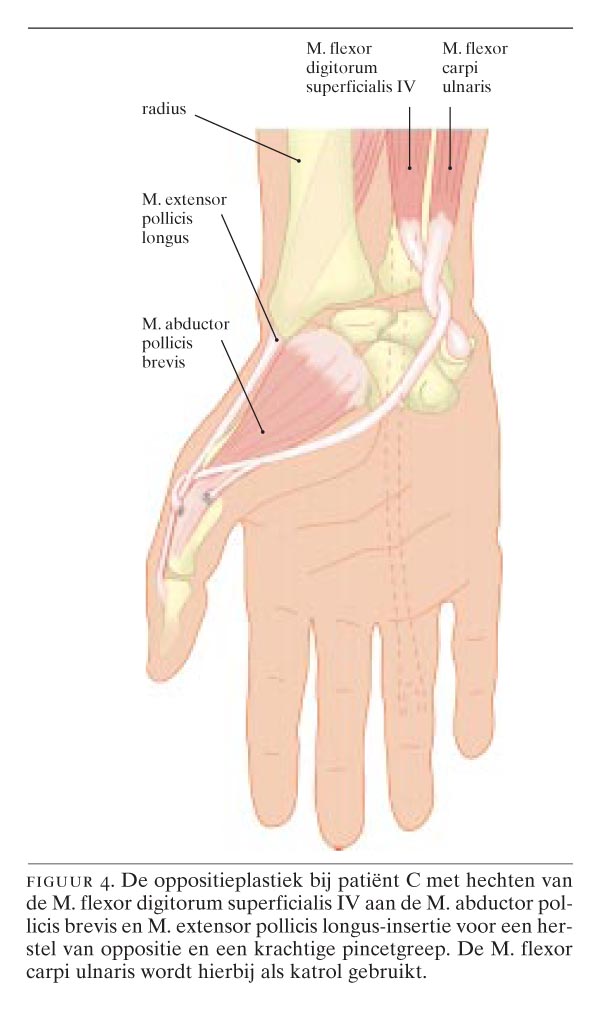 De uitval van de N. medianus bij patiënt C maakt het brengen van de duim tegenover de vingertoppen, de oppositie, onmogelijk. Dit is een samengestelde beweging van abductie, pronatie en flexie, totstandkomend door het samenspel van de duimmuisspieren (M. abductor pollicis brevis, M. flexor pollicis brevis en M. opponens pollicis). Na een parese of paralyse van deze spieren is het manipuleren van kleine voorwerpen moeilijk tot onmogelijk uitvoerbaar. Tevens is bij deze fijne handmotoriek een intacte sensibiliteit onmisbaar, waardoor deze een belangrijk aandachtspunt is bij het klinisch onderzoek. Om de oppositie mogelijk te maken moet de getransponeerde pees trekken in de richting van het os pisiforme met een parallel verloop aan de vezels van de M. abductor pollicis brevis.9 10 In dit geval kozen wij voor de transpositie van de oppervlakkige buiger van de ringvinger. De juiste richting wordt verkregen door de pees van de ulnaire polsbuiger als katrol te gebruiken.24 910