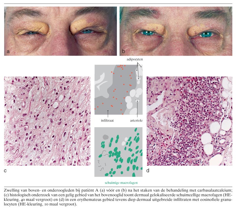 Hoewel een duidelijke tijdsrelatie tussen de gebruikte medicatie en het ontstaan van de klachten ontbrak, namelijk 2 jaar na het starten met carbasalaatcalcium, 1 jaar na het eerste gebruik van simvastatine en salmeterol-fluticason, werd vervolgens toch, mede gezien de eosinofilie van perifeer bloed, huid en bronchoalveolaire vloeistof, een geneesmiddelreactie overwogen. Carbasalaatcalcium werd vervangen door acenocoumarol. Hierna verdwenen, onder voortzetting van het prednisolongebruik, 15 mg/dag, de oedemateuze zwelling van de oogleden en de andere klachten binnen 2 dagen (zie figuur b). Prednisolon werd volledig uitgeslopen, zonder recidiefklachten. Het aantal eosinofiele cellen in het perifere bloed daalde vrijwel naar de referentiewaarde. De xanthelasmata werden na enkele weken door de oogarts geëxcideerd; in het excisiemateriaal werden geen eosinofiele infiltraten of oedeem meer aangetroffen.