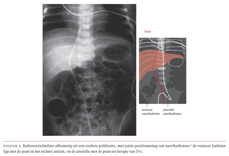 De veneuze navelkatheter volgt de V. umbilicalis in de richting van de ductus venosus die in de lever gelegen is.8 Hierna vervolgt de veneuze katheter zijn weg naar de V. cava inferior om juist vóór het rechter atrium te eindigen. Dientengevolge is op een buikoverzichtsfoto een juist gepositioneerde veneuze katheter rechts naast de wervelkolom ter hoogte van het diafragma gelegen (figuur 2).8