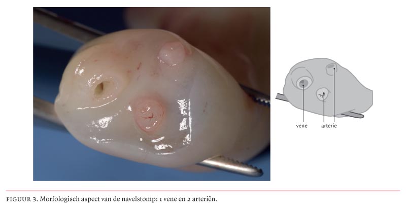 Teneinde een verkeerde positie van een navelkatheter te voorkómen, is het in de eerste plaats belangrijk de morfologische kenmerken van de 3 vaten in de navelstreng te herkennen (figuur 3). De V. umbilicalis is dunwandig en veelal in het bovenkwadrant van de navelstomp gelegen. De Aa. umbilicales zijn 2 stevige, gecontraheerde bloedvaatjes. Daarnaast kan men letten op de aanwezigheid van pulsaties. Morfologische kenmerken zijn niet altijd herkenbaar en pulsaties niet altijd zichtbaar of voelbaar. Hierdoor blijft het risico van katheterisatie van een verkeerd vat bestaan. Derhalve zijn aanvullende methoden gewenst om de positie van een ingebrachte navelkatheter te verifiëren, zoals het maken van een röntgenfoto. Ook kan een gasanalyse van bloed afgenomen uit de katheter of het registreren van een drukcurve behulpzaam zijn bij het beoordelen van de positie van een navelkatheter. Het stapsgewijs nalopen van bovenstaande punten verdient aanbeveling om overbodige diagnostiek en onnodige complicaties ten gevolge van navelkathetergeïnduceerde persisterende hypoglykemieën te voorkómen.