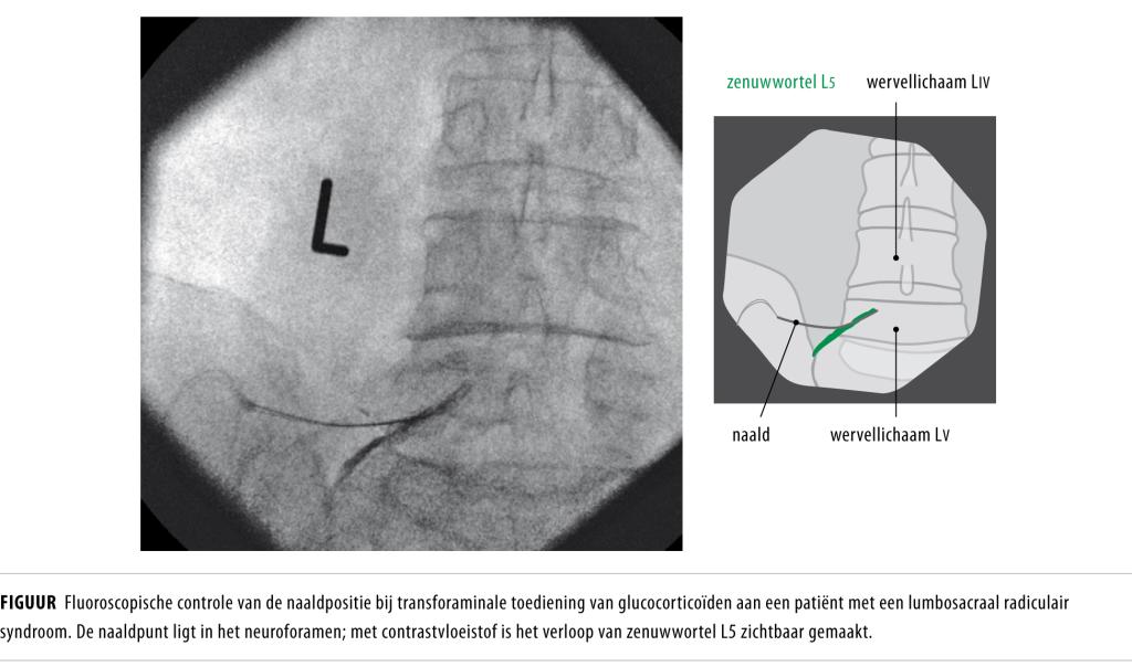 Als onderdeel van een niet-operatief traject kan men behalve bewegingsadviezen, oefentherapie en pijnmedicatie ook epidurale injecties met glucocorticoïden geven. Dit gebeurt in de regel door een anesthesioloog onder fluoroscopische controle, wat inhoudt dat contrastvloeistof wordt ingespoten onder continue röntgendoorlichting. In de CBO-Richtlijn ‘Lumbosacraal radiculair syndroom’ uit 2008 wordt geconcludeerd dat epidurale glucocorticoïdinjecties kunnen worden overwogen als andere vormen van pijnstilling tekortschieten.5 Transforaminale toediening verdient dan de voorkeur.6