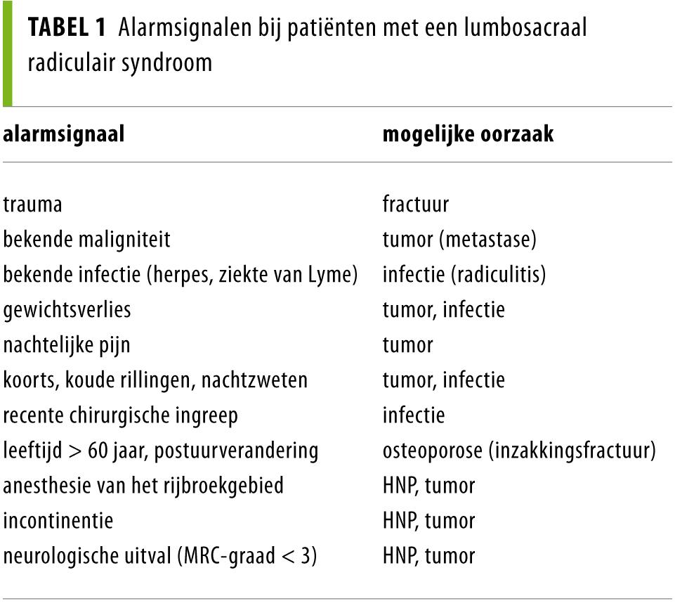 De patiënt zal in eerste instantie de huisarts bezoeken, die conform de NHG-standaard ‘Lumbosacraal radiculair syndroom’ zal kiezen voor een conservatief traject met pijnstilling, vaak aangevuld met fysiotherapie.1 Wanneer de klachten langer dan 6 weken aanhouden, als de pijn niet onder controle te krijgen is met medicatie of bij neurologische uitval volgt verwijzing naar de tweede lijn. Dat geldt ook wanneer er ‘rode vlaggen’ zijn, alarmsignalen die snelle verwijzing naar het ziekenhuis voor diagnostiek en behandeling rechtvaardigen (tabel 1).