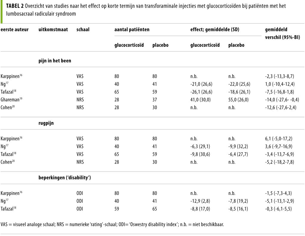 Er zijn tegenstrijdige resultaten in de literatuur te vinden over de effectiviteit van epidurale glucocorticoïdinjecties bij patiënten met het lumbosacraal radiculair syndroom. Daarom is recent een systematische review uitgevoerd naar het effect van deze injecties in vergelijking met placebo.15 Na een uitgebreide zoektocht in alle relevante databases vonden de onderzoekers 23 studies, beschreven in 25 publicaties. De studies naar de kortetermijneffecten van transforaminale toediening – binnen 3 maanden – zijn weergegeven in tabel 2.16-20