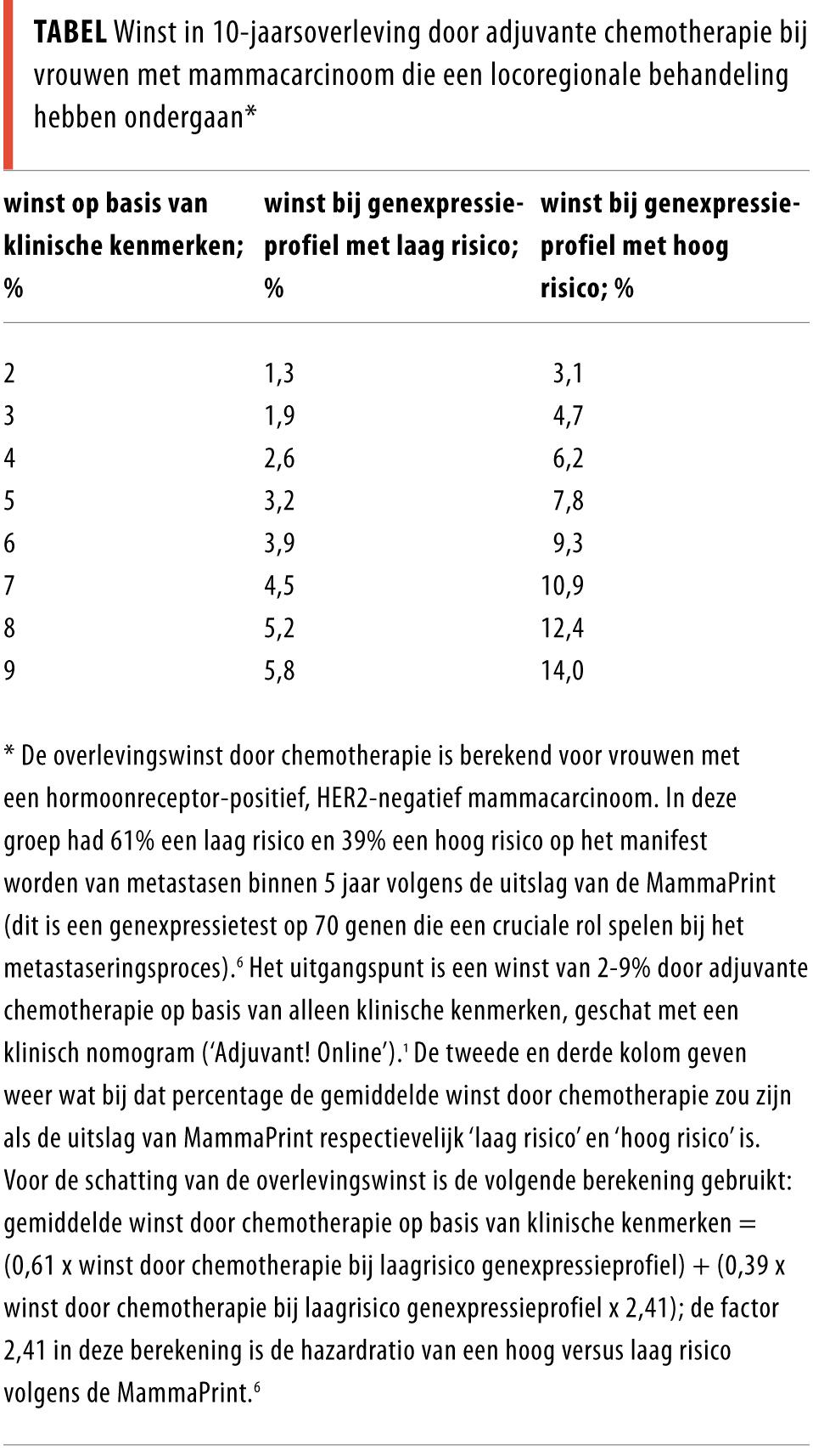In Nederland wordt een terughoudend beleid gevoerd ten aanzien van chemotherapie; gemiddeld 42% van alle patiënten met een invasief mammacarcinoom ontvangt chemotherapie.2 Oncologen overwegen chemotherapie als ten minste 3 op de 100 vergelijkbare patiënten hierdoor na 10 jaar extra in leven zijn. Een kleinere winst weegt niet op tegen het risico van ernstige toxiciteit, dat circa 2% bedraagt. Uiteraard is de mening van de patiënt over de waarde van de beoogde winst door de behandeling…