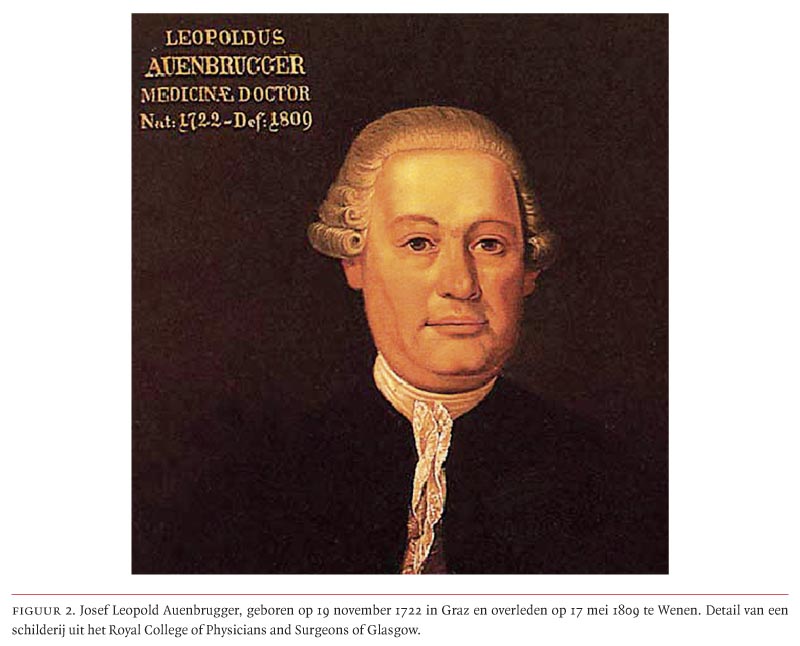 Lange tijd bestond er verwarring over ziekten in de borstkas. Het was moeilijk pneumonie te onderscheiden van pleuritis, dit veelal tot ongenoegen van de heelmeesters, die geacht werden een pleura-empyeem te ontlasten. Het was de jonge Weense arts en herbergierszoon Leopold Auenbrugger (1722-1809) die in 1761 waarnemingen openbaar maakte in een boek met de sprekende titel Inventum novum ex percussione thoracis humani ut signo obstrusos interni pectoris morbos detegendi (figuur 2). Hij beschreef daarin een nieuwe uitvinding waarbij door middel van kloppen ziekten die zich in de borstkas verstoppen aan het licht konden worden gebracht, dit naar analogie van het kloppen op wijn- en biervaten ter controle van de vulling.6 De Weense geneeskunde bleek echter nog niet rijp voor de toepassing van deze bijzondere vorm van lichamelijk onderzoek; men kon de waarde ervan nog niet inschatten. Zo besteedden de artsen die met Auenbrugger samenwerkten, waaronder zijn leermeester Van Swieten, er geen aandacht aan in hun geschriften (figuur 3).7 8 En hoewel Maximilian Stoll de Weense belangstelling voor de percussie voor korte tijd wist te wekken, verdween deze spoedig na diens overlijden.9 10