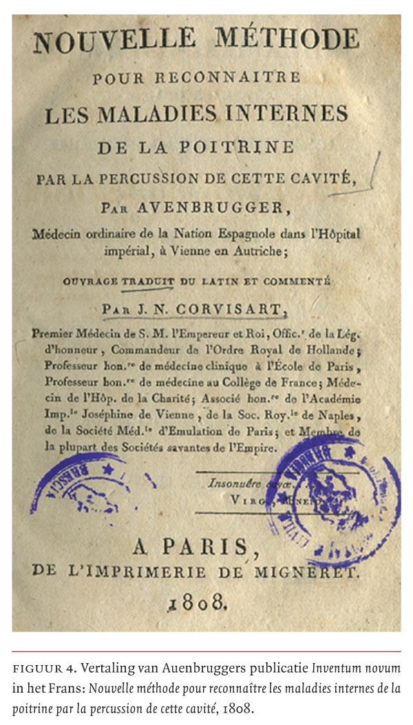 William Cullen (1710-1790), in zijn dagen een leidend clinicus, had wel gehoord van Auenbruggers methode, maar gebruikte deze nooit en bleef zijn diagnostiek baseren op een brief waarin hij de patiënt diens symptomen liet noteren.11 Verschillende Duitse universiteiten, zoals die in Halle, Wittenberg, Würzburg en Rostock, schonken in hun onderwijs daarentegen wèl aandacht aan de nieuwe techniek. Tijdens een bezoek aan Wenen zag Corvisart des Marest (1755-1821), van oorsprong chirurgijn, in een van Stolls Aphorismen de verwijzing naar Auenbruggers uitvinding.12 Nadat hij de methode had beproefd, vertaalde hij de Inventum novum in het Frans en voorzag deze van aantekeningen. Corvisart publiceerde zijn geschrift in 1808, één jaar voor Auenbruggers overlijden (figuur 4).13 Zijn roem zorgde voor de verspreiding van de Inventum novum in de medische wereld. Corvisarts leerling Laënnec (1781-1826) maakte de nieuwe diagnostische methode echter pas echt populair door zijn uitvinding van de stethoscoop in 1816.14 Hij vond de toevoeging van percussie aan auscultatie voor het diagnosticeren van empyeem, pneumothorax en pleuravocht van uitermate groot belang. Dat in Kopenhagen en Parijs vooral ook heelmeesters belangstelling hadden voor de combinatie van percussie en auscultatie als hulpmiddel bij het bepalen van de juiste toegangsweg voor een operatie, was niet zo verwonderlijk.15 16 Zij waren immers uiteindelijk verantwoordelijk voor de behandeling van het empyeem door middel van opening van de borstholte.