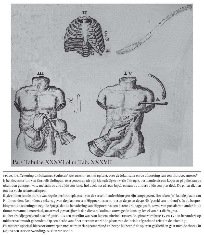 De Leidse chirurgijn Cornelis Solingen (1641-1687) voerde in 1684 de paracentesis thoracis uit bij ‘lijders’ aan ‘water om de longen’ en bij patiënten bij wie de thoraxholte gevuld was met bloed of etter, met als doel de ademhaling te verlichten.20 Om aan te geven hoe deze ingreep naar behoren kon worden uitgevoerd via een juiste incisie, haalt hij in zijn boek Johannes van Horne aan, die zei: ‘dat men alle scrupulen voorkomt, om de plaets te vinden, als men een draad van de Mucronata cartilago tot een der punten van de Vertebren van de Ruggraed, dan deelt men die lengte in drien, ende waer dat tweederden deelen van den draad, van ’t Sternum af beginnende eyndigen, daer is de regte plaats. Eenige experientie maeckt geen regel’. Zelf beval Solingen echter de rugzijde aan. Handbreed naast de wervelkolom aan de linkerkant boven de 2e rib of aan de rechterzijde van de 3e rib, ‘steeds gerekend vanaf de onderzijde’, maakte hij daar een incisie, gevolgd door het klieven van de musculatuur tussen de ribben. Daarna moesten de patiënt en de omstanders zeer stil zijn, om het ploffende geluid van het klieven van de pleura parietalis goed te kunnen horen. De chirurgijn had dan de thoraxholte bereikt. Waren de pleurabladen verkleefd, dan werden ze met behulp van een sonde van elkaar gescheiden en kon het in de thoraxholte opgehoopte ‘water offer bloedig vlees in gewassen was’ worden gedraineerd. Solingen had hiervoor een instrument ontwikkeld, dat hij ‘decussorium’ noemde. Hiermee konden de longen opzij worden gehouden, zodat vloeistof kon worden gedraineerd in het geval de longen ‘op plaatsen vastzitten, en de vloeistof niet naar behoren kan ontsnappen’ (zie figuur 6).20 Deze min of meer op de tast uitgevoerde ingreep waarmee de chirurgijn toegang kon krijgen tot de pleuraholte zou men tot in het begin van de 19e eeuw blijven uitvoeren.