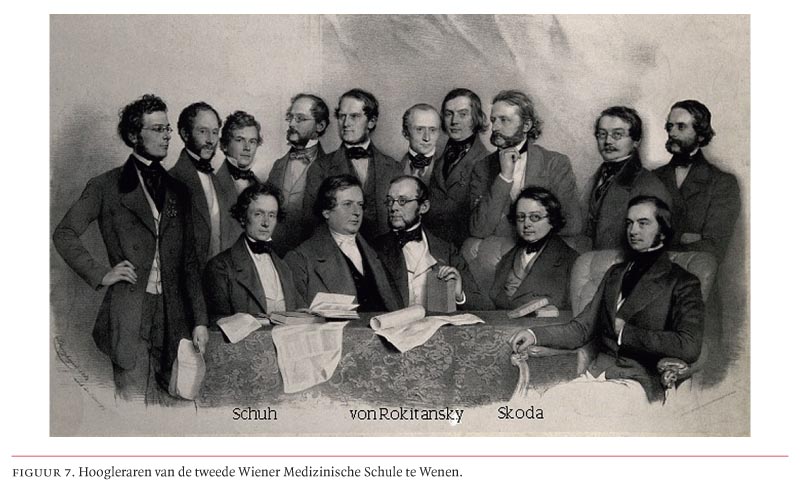 Inmiddels had zich in het derde decennium van de 19e eeuw in Wenen een groep geformeerd rondom Josef Škoda (1805-1881), die de diagnostiek door middel van percussie en auscultatie weer helemaal in Wenen had teruggebracht door hieraan een natuurwetenschappelijke impuls te geven. In tegenstelling tot de grote (her)ontdekkers en ontwikkelaars hiervan, Auenbrugger, Corvisart en Laënnec, interpreteerde Škoda longgeluiden en hartgeruisen niet natuurfilosofisch en fenomenologisch, maar symptomatisch en fysisch. De klinische bevindingen vergeleek hij in Rokitansky’s pathologie-instituut met de bij obductie gevonden veranderingen, wat leidde tot nieuw inzicht in en aanvaarding van de genoemde onderzoekstechnieken.21 Škoda behoorde samen met de chirurg Franz Schuh (1804-1865) en de patholoog Carl Rokitansky (1804-1878) tot de stichters van de tweede Wiener Medizinische Schule (figuur 7). Voor Schuh, de voorganger van Billroth, waren percussie en auscultatie van primair belang voor zijn heelkundige praktijk. Met deze diagnostische technieken wist hij de behandeling van pleuraziekten te verbeteren.