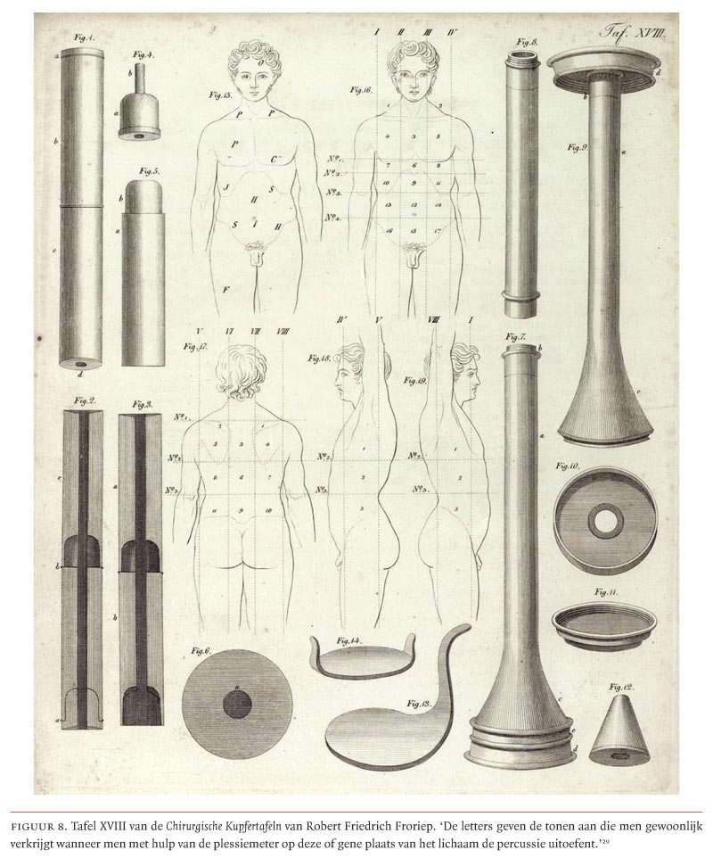Aanvankelijk werden in ons land ook de methode van Piorry, indirecte percussie via een schijfje (plessimeter) dat stevig op de huid werd gedrukt (figuur 8, nummers 13 en 14),28 en percussie met behulp van een hamertje ingevoerd. Langzamerhand werden deze methoden vervangen door de vinger-op-vingerpercussie zoals die vandaag de dag nog geldt.