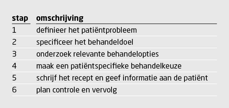 Veilig geneesmiddelengebruik begint bij goed voorschrijven, en goed voorschrijven begint bij rationele farmacotherapie op basis van betrouwbare en actuele kennisbronnen. De WHO heeft een methode ontwikkeld om systematisch goed en rationeel voor te schrijven, de ‘WHO 6-step’-methode (tabel 1).11 Bij ouderen kan de keuze voor een specifiek geneesmiddel onder andere worden gebaseerd op de geneesmiddelenrapporten van het Expertisecentrum Pharmacotherapie bij Ouderen (www.ephor.nl). Informatie uit deze rapporten is ook terug te vinden in de gratis Ephor-app (https://ephorapp.nl) . Om de kwaliteit van het voorschrijven in het ziekenhuis te bevorderen is een zelfassessment ontwikkeld (www.voorschrijftoets.nl). Dit zelfassessment is gericht op de vaakst voorkomende aan farmacotherapie gerelateerde problemen en toetst de kennis van de voorschrijver over het goed en rationeel voorschrijven, waarna zo nodig gerichte bijscholing kan plaatsvinden. Als dit zelfassessment standaard deel uitmaakt van het introductieprogramma van nieuwe artsen in het ziekenhuis, leidt dit tot minder voorschrijffouten.12 Het zelfassessment bevat verschillende modules en is voor elke instelling beschikbaar.