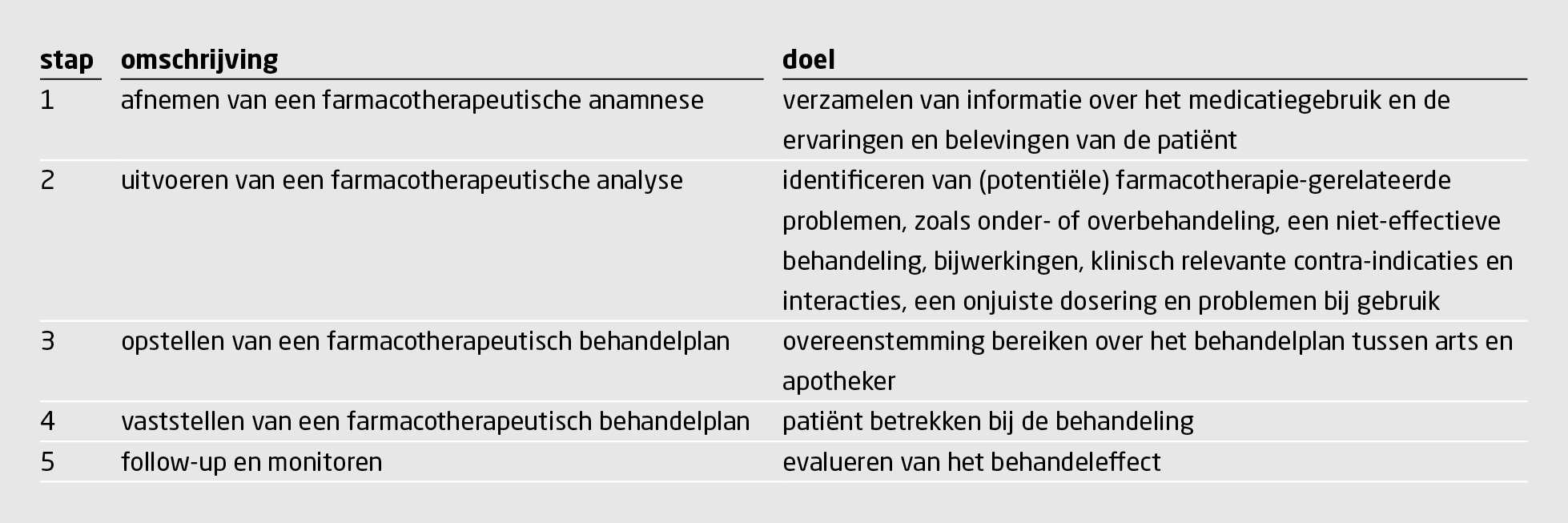 Toch kan het gebeuren dat er farmacotherapeutische problemen ontstaan die nadere analyse noodzakelijk maken. De farmacotherapie kan op verschillende manieren worden beoordeeld, met of zonder patiëntconsult. De uitgebreidste vorm is een zogenoemde medicatiebeoordeling, waarin de farmacotherapie integraal wordt beoordeeld door patiënt (of mantelzorger), arts en apotheker op basis van een gestructureerde, kritische evaluatie van medische informatie, farmacologische informatie en gebruiksinformatie. Het doel van een medicatiebeoordeling is om de effectiviteit en veiligheid van de farmacotherapie te optimaliseren. Daarbij kan gebruikgemaakt worden van de ‘Systematic tool to reduce inappropriate prescribing’ (STRIP), een instrument om het voorschrijven van potentieel ongeschikte medicijnen te voorkómen (tabel 2).5,14
