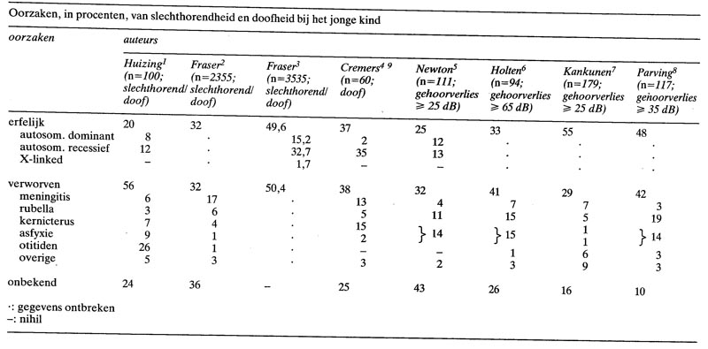 Bij de helft van deze kinderen is een erfelijke aandoening oorzaak van hun handicap (tabel).1-12 De erfmodus is dan meestal autosomaal recessief. De mogelijkheid van een erfelijke aandoening wordt echter helaas lang niet altijd overwogen, zodat bij lang niet alle patiëntjes erfelijkheidsonderzoek wordt verricht en erfelijkheidsinformatie wordt gegeven aan ouders en, eventueel, andere familieleden. Erfelijkheidsinformatie kan leiden tot een zekere mate van preventie van doofheid, want hierdoor leren ouders en ook andere familieleden de herhalingskans kennen. Dit kan ertoe leiden dat zij afzien van de wens om kinderen te krijgen.13-14