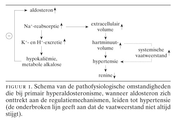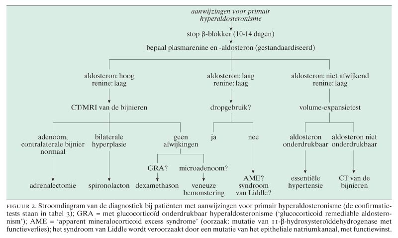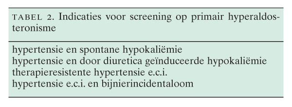 Volgens de recent herziene CBO-richtlijn ‘Hoge bloeddruk’ is primair hyperaldosteronisme (PHA), autonome secretie van aldosteron door de bijnier, in Nederland ook in de tweede en derde lijn een zeldzame aandoening, met een frequentie van minder dan 0,5 binnen de populatie van hypertensieve patiënten.1 Dit gegeven strookt slecht met een aantal recente publicaties waarin frequenties van boven de 10 worden gerapporteerd.2-6 Dit grote verschil wordt waarschijnlijk vooral verklaard door het aselectieve gebruik van de bepaling van de aldosteron-renineratio als screeningstest binnen de populatie met hypertensie in diverse centra.7-9 Indien deze ratio een bepaalde afkapwaarde overschrijdt, wordt de aanwezigheid van PHA aannemelijk geacht, alhoewel de definitieve diagnose met een van de confirmatietests moet worden bevestigd. Wijzelf zijn van mening dat PHA nog steeds een relatief zeldzame aandoening is, waarop men in voorkomende gevallen, die nog ter sprake worden gebracht in dit artikel, bedacht moet zijn.