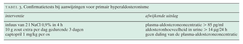 Zoals is weergegeven in het stroomdiagram, kan het laboratoriumonderzoek verschillende uitkomsten opleveren (figuur 2). Indien de plasma-aldosteronconcentratie te hoog is en renine onderdrukt is, is de diagnose ‘PHA’ biochemisch rond en kan men direct overgaan tot het afbeeldend onderzoek. Indien renine onderdrukt is en de plasma-aldosteronconcentratie hoognormaal, is er een indicatie voor een aldosteronsuppressietest. Diverse aldosteronsuppressietests zijn beschreven en beproefd. De twee belangrijkste zijn volume-expansie door middel van een zoutinfuus of orale zouttoediening en de captopril-aldosteronsuppressietest.15-18 De wijze van uitvoeren van deze tests en de interpretatie staan beschreven in tabel 3. Wegens de gecontroleerde omstandigheden gaat onze voorkeur uit naar de volume-expansie door middel van een fysiologischzoutinfuus (2 l in 4 h). De negatief voorspellende waarde van de volume-suppressietests is vrijwel 100.