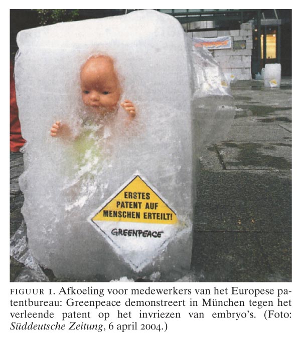 De ruim 150 medewerkers van het Europese patentbureau (EPB) in München wachtte maandagochtend 5 april een koele ontvangst. Greenpeace-activisten hadden namelijk de ingang van het hoofdkantoor met ijsblokken afgezet. In de ijsblokken zaten ingevroren babypoppen als protest tegen een zogenoemd ‘biologisch patent’ (figuur 1). ‘De tijd dat niet…