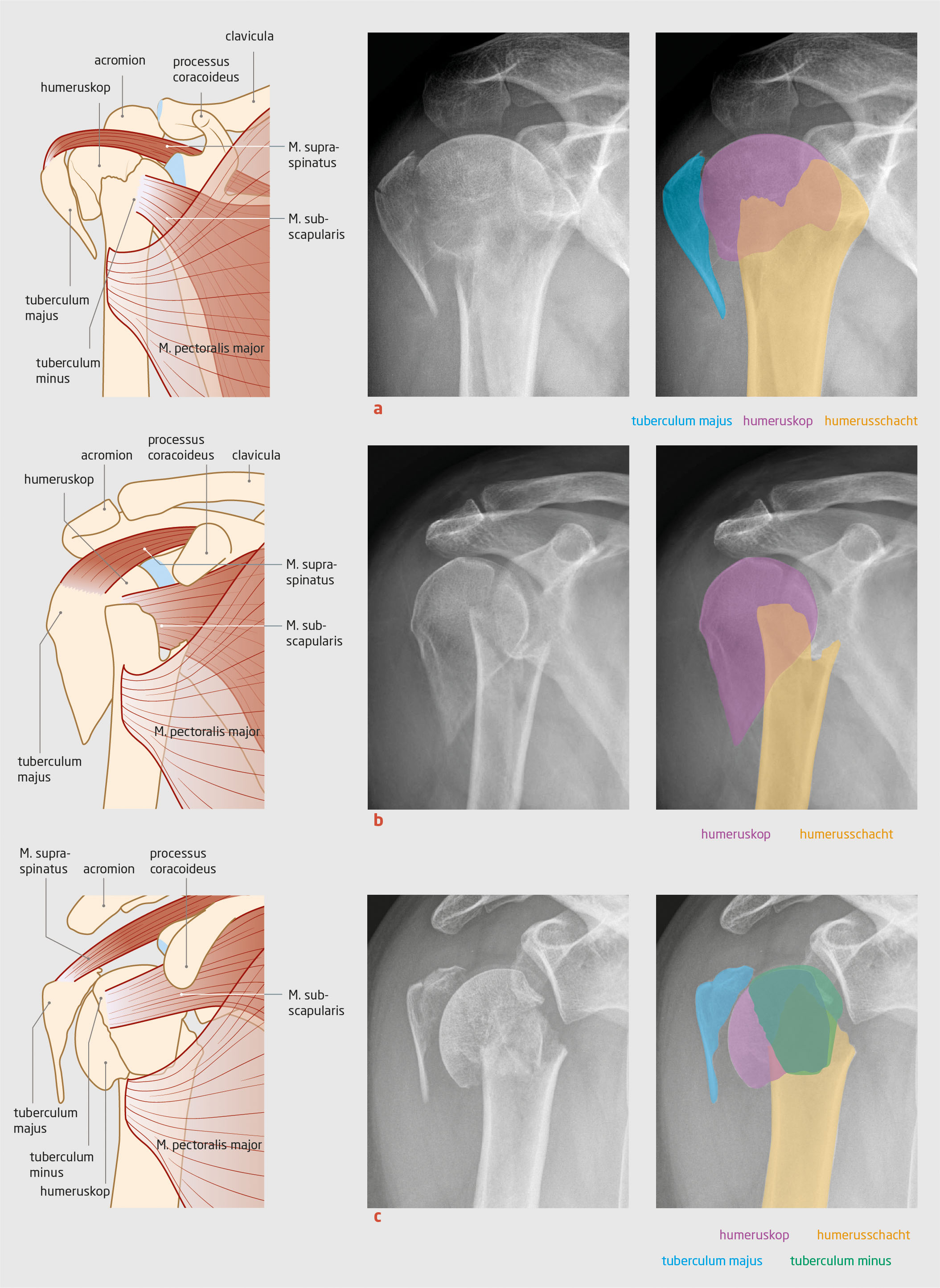 Van oudsher wordt gesproken over ‘subcapitale humerusfracturen’. Deze naamgeving is gewijzigd in ‘proximale humerusfracturen’, aangezien veel fracturen van de proximale humerus niet alleen subcapitaal zijn, maar meer fragmenten van de humeruskop betreffen. De proximale humerus breekt meestal volgens een kenmerkend patroon van 2 tot 4 fragmenten. Deze fragmenten zijn de humeruskop met het gewrichtsvlak, tuberculum majus, tuberculum minus en de humerusschacht (figuur 1). Deze fracturen ontstaan meestal door een val met uitgestrekte arm of direct op de schouder. Bij klinische verdenking op een proximale humerusfractuur wordt een röntgenopname gemaakt in 2 richtingen. Bij gedislokeerde intra-articulaire fracturen heeft CT toegevoegde waarde.