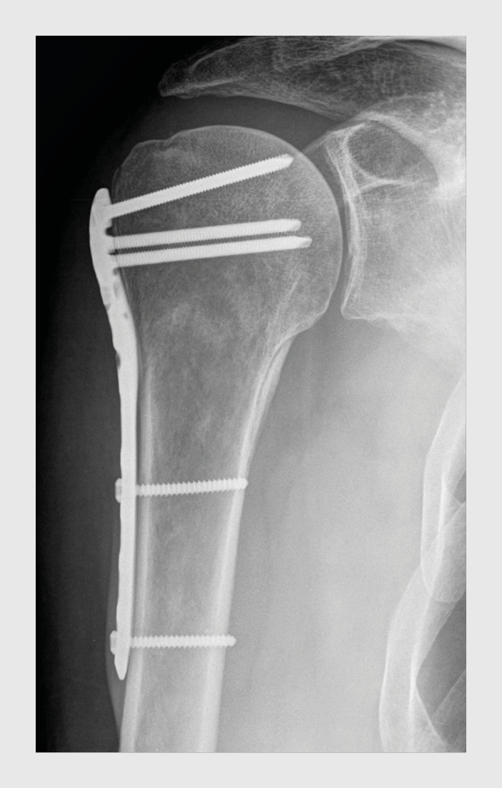 Met de komst van hoekstabiele implantaten zijn er naast de bekende conservatieve behandeling nieuwe behandelmogelijkheden ontwikkeld met bijvoorbeeld plaat- of penosteosynthese (figuur 3).8-10 Deze ontwikkeling heeft ook geleid tot minimaal-invasieve technieken die voordelen bieden boven de klassieke open behandeling van fracturen, maar zijn deze technisch lastig en hebben een langere leercurve. Een prothese kan uitkomst bieden bij de behandeling van proximale humerusfracturen. De voordelen van operatie zijn een vroege functionele nabehandeling, minder kans op non-union en een anatomische reconstructie of prothese, wat in theorie zou moeten leiden tot een betere functioneel resultaat.6,10