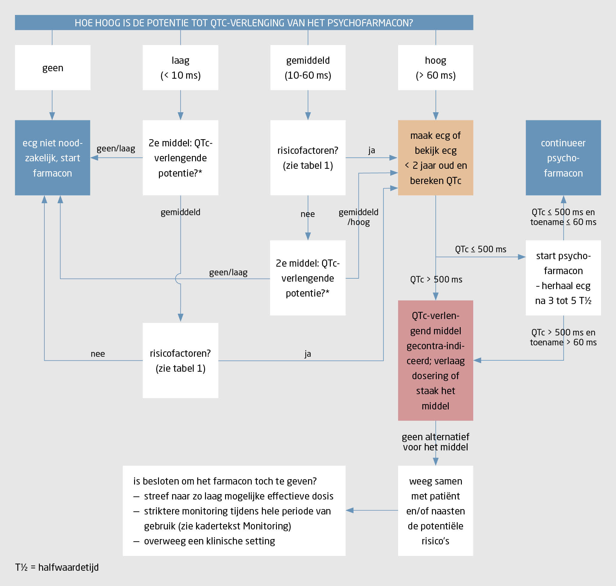 - Inschatting van het risico op ritmestoornissen vereist kennis over geneesmiddelen die het QTc-interval kunnen verlengen enerzijds en over patiëntgebonden risicofactoren voor QTc-intervalverlenging en hartritmestoornissen anderzijds. De combinatie van beide bepaalt of ecg-monitoring nodig is wanneer een patiënt met een psychofarmacon begint.