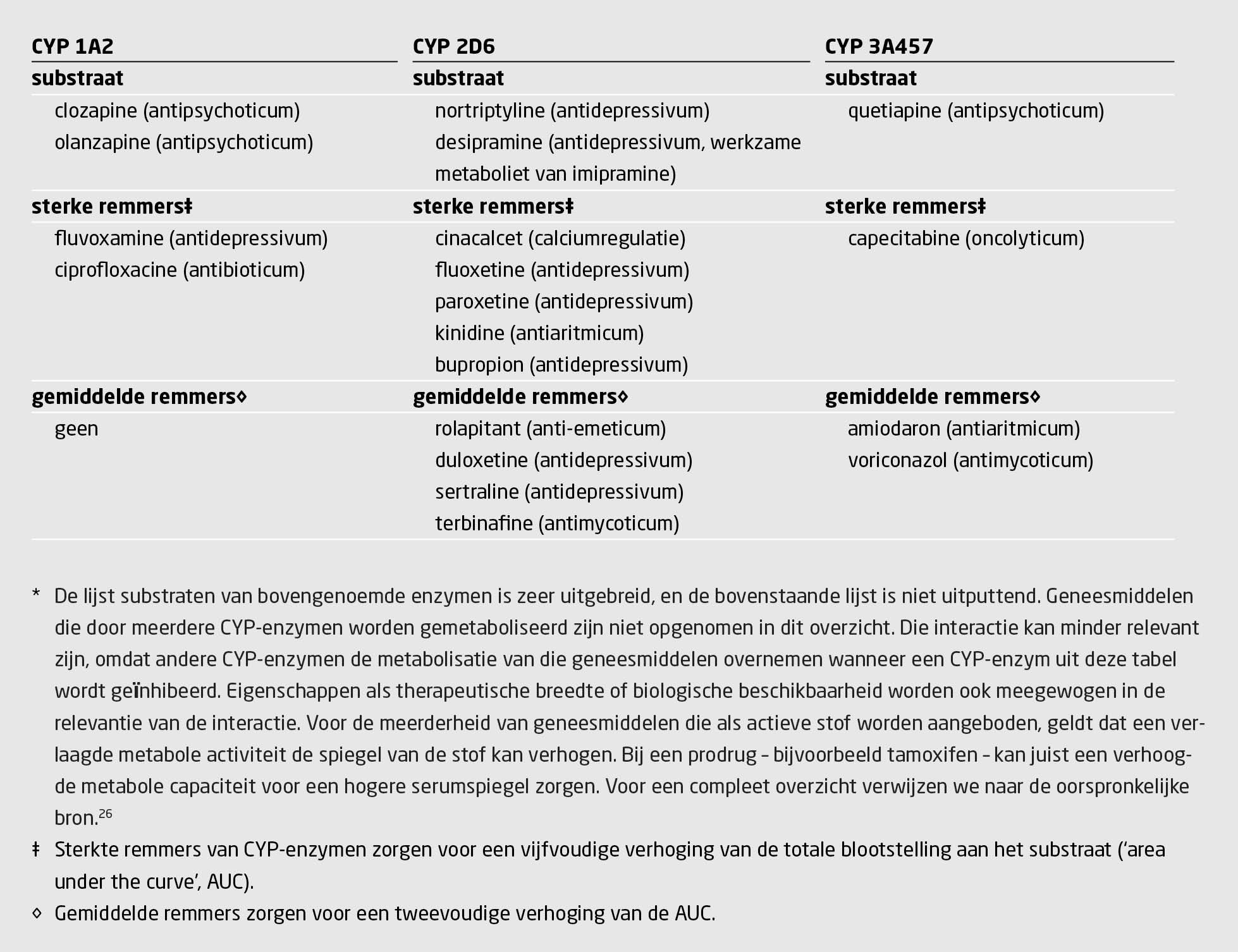 Het intrinsieke QT-verlengend potentieel van een geneesmiddel kan worden versterkt door een combinatie met andere QT-verlengers of door onbedoeld hoge plasmaspiegels. Hoge plasmaspiegels kunnen optreden bij patiënten met bepaalde farmacogenetische variaties (‘poor metabolizers’), maar ook door interacties die de absorptie van het geneesmiddel verhogen of de eliminatie remmen. Dit laatste betreft vaak een interactie op het niveau van CYP-enzymen (tabel 3).