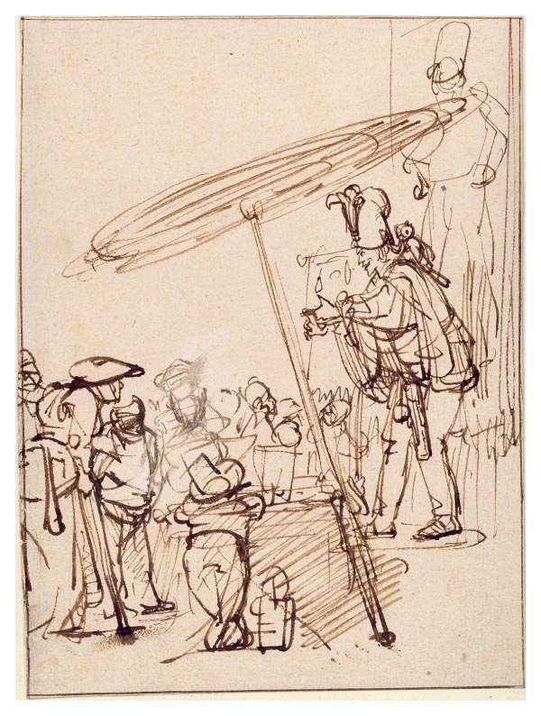 Onder de amusante genreafbeeldingen is deze tekening (circa 1637) van een kwakzalver-dokter die zijn dubieuze middelen op de markt aanprijst. Het publiek staat vol aandacht om hem heen, luisterend naar zijn gladde praatjes over medicijnen met een bijzondere werking. Dergelijke figuren hadden op de markt ook een grote vermakelijkheidswaarde. Afbeeldingen van hen waren populair in de Nederlandse schilderkunst, maar deze lieden werden ook vaak beschreven in de literatuur; de kunstenaar kon zo de nadruk leggen op de dwaasheid van de mens.