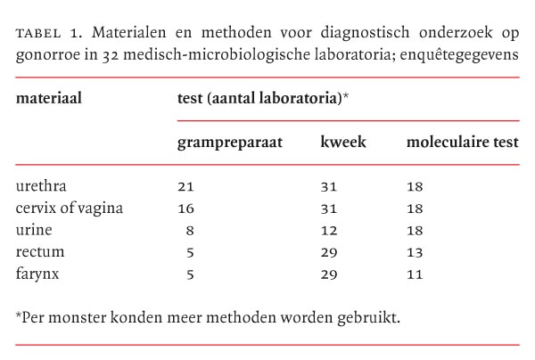 Van de 39 laboratoria stuurden 32 de vragenlijst terug. 13 laboratoria verrichtten diagnostiek met alleen kweek en 19 laboratoria met kweek en/of een moleculaire test. In 2002 werd 2666 en in 2003 2190 maal gonorroe vastgesteld, hetgeen een incidentie betekent van 33,5 per 100.000 inwoners in 2002 en 27,0 in 2003. Het percentage resistentie voor bètalactamantibiotica (penicilline en amoxicilline) was 12,2 in 2002 en 10,7 in 2003, en voor tetracycline respectievelijk 18,5 en 20,6. De resistentie voor chinolonen nam toe van 6,6 in 2002 naar 9,5 in 2003. De resistentie voor cefalosporinen was laag (0,5 in 2002 en 1,2 in 2003). Er werden regionale verschillen in resistentiepatronen gevonden.