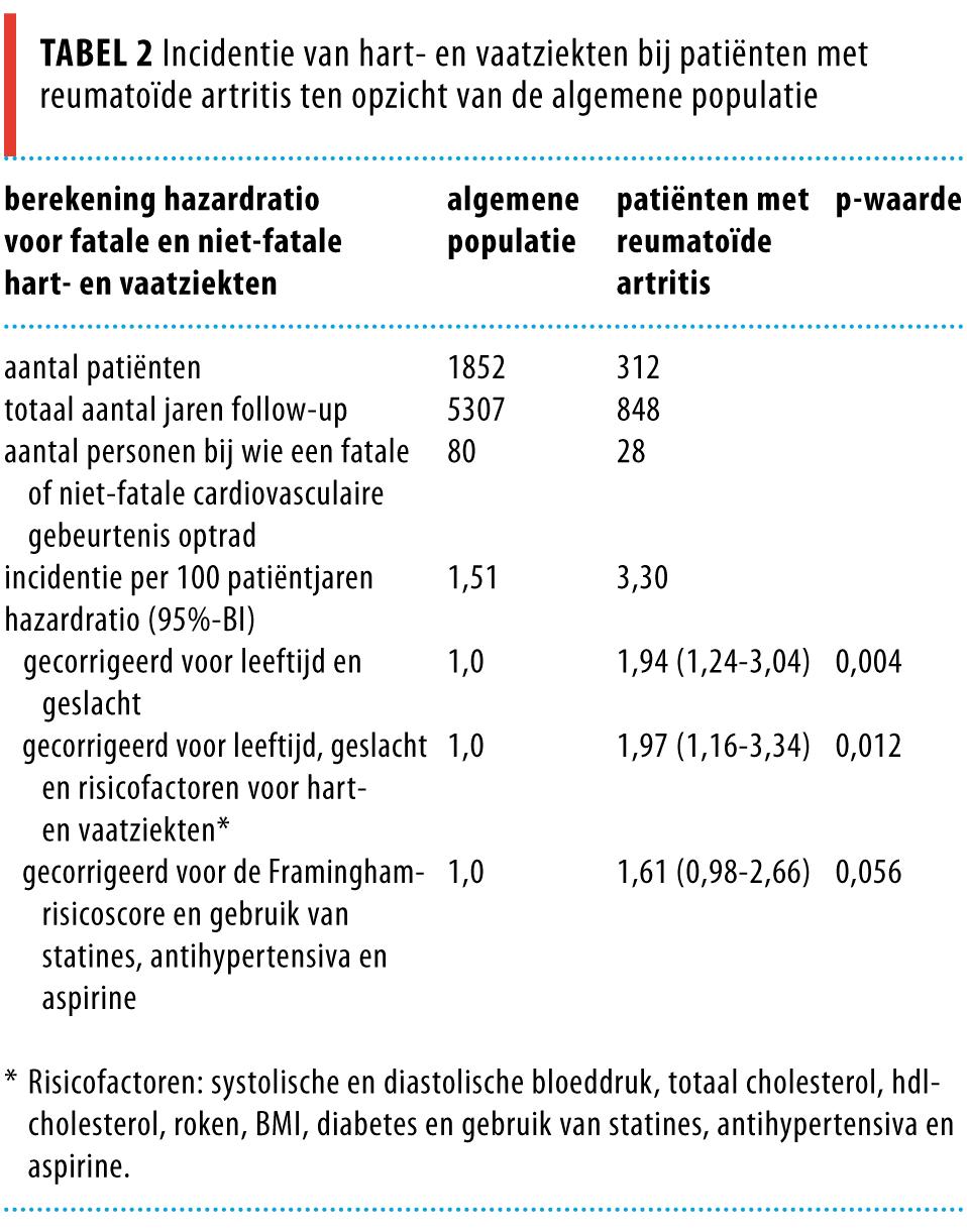 In 2001-2002 werden in totaal 353 patiënten met RA geïncludeerd in een cohort. Alle patiënten werden na 3 jaar opnieuw gezien om de 3-jaarsincidentie van HVZ te bepalen. Deze werd met een cox-regressiemodel vergeleken met de 3-jaarsincidentie van HVZ in een cohort van 1852 personen uit de algemene bevolking, van wie 155 DM2 hadden. Fatale en niet-fatale HVZ werden geclassificeerd volgens ICD-9-criteria.
