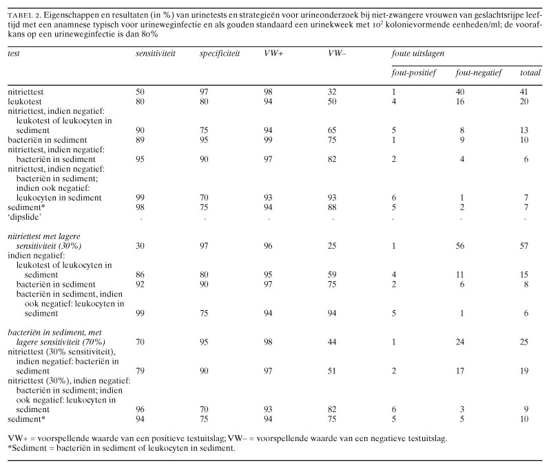 Vrijwel gelijktijdig verschenen eind 1999 de herziene versies van de CBO-consensus en de standaard van het Nederlands Huisartsen Genootschap (NHG) over het onderwerp urineweginfecties.1-3 Eén van de kwesties die opvallen, is dat de aanbevelingen voor het onderzoek van de urine bij klachten van acuut pijnlijke en frequente mictie ten dele uiteenlopen. De CBO-consensus kiest voor gebruik van de nitriettest, bij negatieve uitkomst gevolgd door microscopisch onderzoek van het sediment op de aanwezigheid van bacteriën of leukocyten. De NHG-standaard gebruikt eveneens de nitriettest, maar acht het onderzoek van het sediment op de aanwezigheid van leukocyten onvoldoende betrouwbaar, terwijl de beoordeling van het sediment op de aanwezigheid van bacteriën alleen onder optimale condities bruikbaar wordt geacht. Als alternatief ruimt de NHG-standaard plaats in voor een semi-kwantitatieve kweek met een ‘dipslide’.