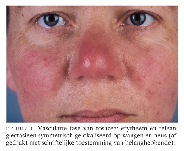 Door de ontwikkelingen in de lasertechnologie is het mogelijk om, nadat de inflammatoire component bedwongen is, resterend erytheem en teleangiëctasieën te verwijderen. De vasculaire hyperreactiviteit verdwijnt echter niet, zodat ‘flushing’ en recidieven nog steeds mogelijk zijn. Grotere, solitaire teleangiëctasieën kunnen behandeld worden met de argonlaser, terwijl de fijnere diffuse afwijkingen goed reageren op de ‘pulse dye’-585-nm-laser of de neodynium:yttrium-aluminiumgarnaat(Nd:YAG)-532-nm-laser.16 Bij 5 tot 20 kan nadien een tijdelijke hyperpigmentatie ontstaan. De pulse-dyelaser is eveneens effectief voor de behandeling van geringe weefselhypertrofie, terwijl het uitgesproken rhinophyma primair chirurgisch behandeld dient te worden. Waar voorheen met de elektrische lis werd gewerkt, kan tegenwoordig met de CO2-laser een fraai resultaat worden bereikt.17