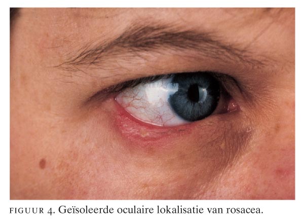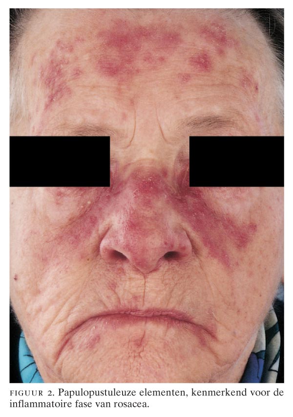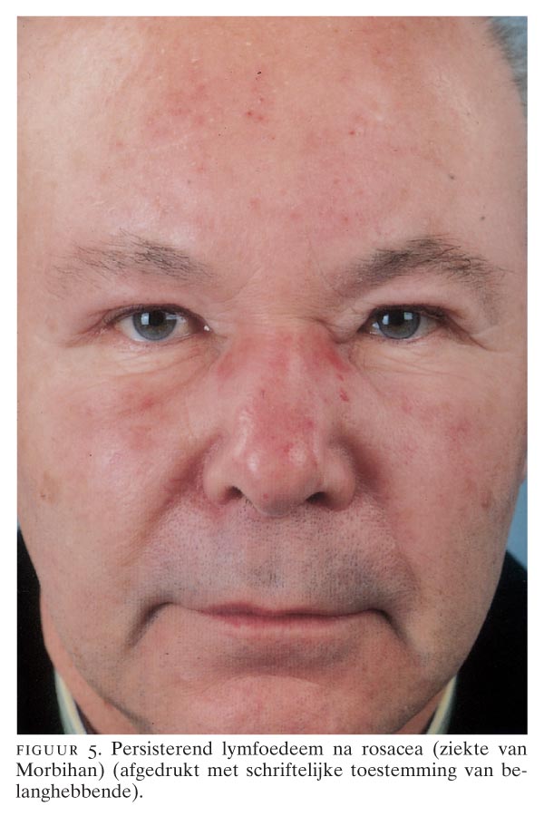 Rosacea is een chronische aandoening van de gelaatshuid die veelal sluipend begint met irritatie door cosmetica en geleidelijk in ernst toeneemt. Ze wordt gekarakteriseerd door een vasculaire component, tot uiting komend in roodheid, persisterend erytheem en teleangiëctasieën (figuur 1), en intermitterende episoden van inflammatie met oedeem en papulopustels, waardoor een acneïform beeld ontstaat (figuur 2). Uiteindelijk kan fibreuze hyperplasie van de neus ontstaan, bekend onder de term rhinophyma (figuur 3). Oculaire betrokkenheid met erytheem en teleangiëctasieën en disfunctie van de glandulae tarsales (klieren van Meibom) is mogelijk (figuur 4). De extreemste, doch zeldzame variant is rosacea fulminans, waarbij multipele confluerende papulonoduli en fistelvorming worden aangetroffen.1 Persisterend lymfoedeem (de ziekte van Morbihan)2 kan als concomitante aandoening ontstaan (figuur 5).