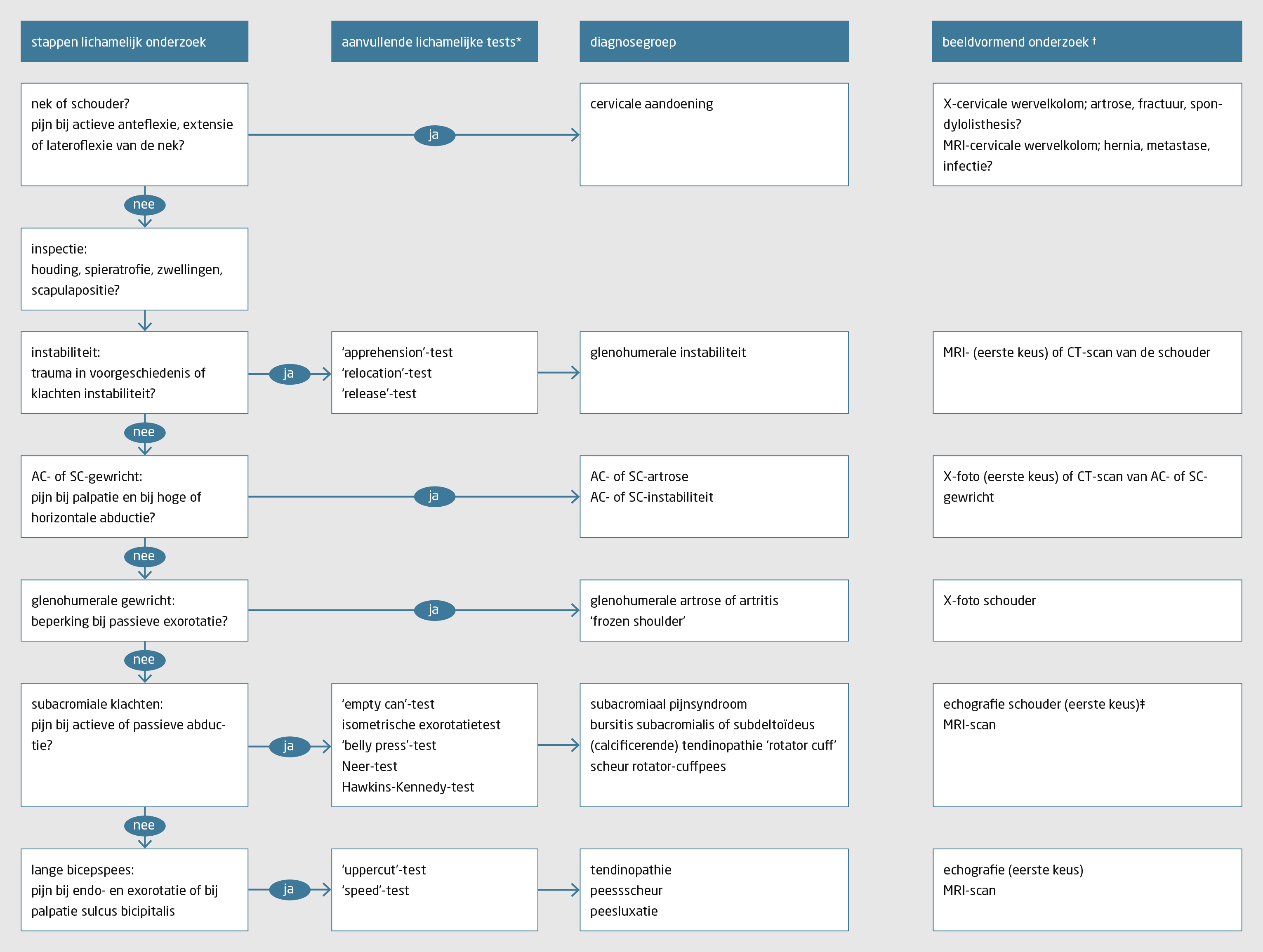 Wanneer er geen sprake is van alarmsymptomen, kan bij het eerste consult worden volstaan met een aspecifieke werkdiagnose, zoals SAPS of glenohumerale klachten. Meerdere factoren, zoals de ernst van de klachten en de leeftijd, het beroep of de sport van de patiënt, kunnen aanleiding geven om sneller uitgebreidere diagnostiek te laten uitvoeren.