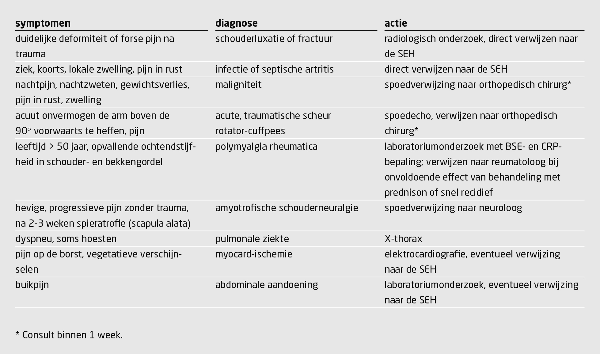 In tabel 2 staan de alarmsymptomen bij schouderklachten en de bijbehorende noodzakelijke acties.