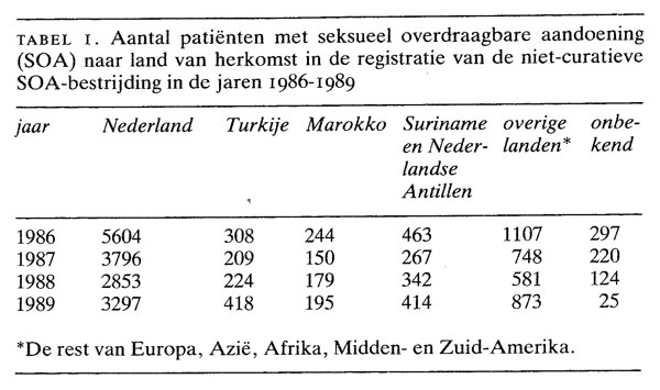 Het totale aantal geregistreerde patiënten met SOA was na een sterke daling in de jaren 1987-1988 weer gestegen in 1989. Deze ontwikkeling was voor mannen en vrouwen vrijwel hetzelfde, maar was niet gelijk voor de verschillende bevolkingsgroepen. In tabel 1 is te zien dat er sprake was van een absolute afname in 1989 ten opzichte van 1986 van het aantal patiënten met SOA uit alle bevolkingsgroepen, behalve voor de Turkse. De daling van het aantal gevallen was het grootst bij de Nederlanders (41). Vanaf 1987 steeg het aantal allochtone patiënten met SOA, terwijl dat voor Nederlandse patiënten met SOA pas vanaf 1989 het geval was. Opvallend was de stijging (35) bij de Turkse bevolkingsgroep.