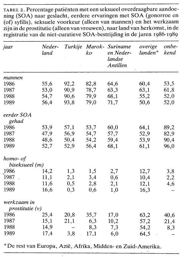 In tabel 2 is te zien dat bij de Nederlanders het aantal mannen met SOA ongeveer gelijk was aan het aantal vrouwen. Bij Turkse en Marokkaanse patiënten was het aandeel van vrouwen klein; dit gold in mindere mate voor Surinaamse en Antilliaanse patiënten. Het percentage SOA-patiënten dat opgaf eerder een SOA (gonorroe en (of) syfilis) te hebben gehad, varieerde van 50 tot 60 voor alle bevolkingsgroepen en leek weer iets toe te nemen. Het percentage Nederlandse homoseksuele mannen met SOA in deze onderzochte groep was in 1989, na een daling in de voorafgaande jaren, weer toegenomen ten opzichte van het percentage in 1986. Het aandeel van allochtone mannen dat homoseksueel gedrag rapporteerde, was laag. Meer dan de helft van de vrouwelijke patiënten, afkomstig uit ‘andere’ landen (rest van Europa, Azië, Afrika, Midden- en Zuid-Amerika) rapporteerde werkzaam te zijn in de prostitutie. Dit percentage was voor Nederlandse vrouwelijke patiënten in de periode 1986-1989 afgenomen van 25 tot 17.