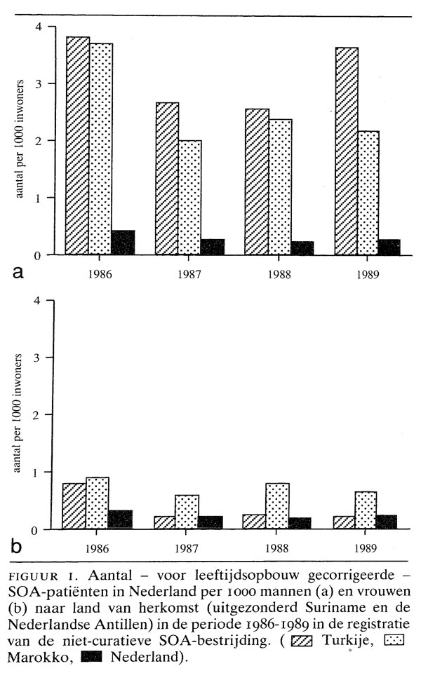 Figuur 1a laat voor Turkse en Marokkaanse mannen een 6-10 keer zo hoog – voor de leeftijdsopbouw gecorrigeerd – SOA-cijfer zien als voor Nederlandse mannen. Het SOA-cijfer bij Turkse mannen was hoger dan dat bij de Marokkaanse mannen en was in 1989 weer gestegen. Bij de vrouwen waren de verschillen tussen de SOA-cijfers per bevolkingsgroep minder groot (figuur 1b). Het hier beschreven patroon in de tijd was ongeveer gelijk voor Amsterdam, Rotterdam en Den Haag. De SOA-cijfers verschilden echter per stad.