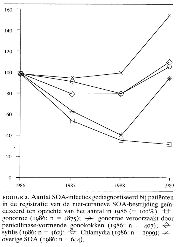 Het hier geobserveerde verloop van het aantal gevallen van gonorroe, syfilis en Chlamydia komt overeen met ontwikkelingen zoals deze eerder zijn gerapporteerd:6-810 enerzijds in 1989 een stabilisering van de daling van het totale aantal gevallen van gonorroe (inclusief een lichte stijging bij homoseksuele mannen); anderzijds een stijging van het aantal gevallen van gonorroe door penicillinase-vormende gonokokken, syfilis en Chlamydia na een daling in 1987 en 1988. De trendbreuk in 1989 kan een aanwijzing zijn voor een toename van onveilig seksueel gedrag. De verschillen in trends tussen de SOA onderling kunnen te maken hebben met biologische eigenschappen van het betreffende micro-organisme, met verbeterde diagnostiek, mogelijk met het voorkomen van verschillende SOA bij diverse groepen en met verschillen in gedragsveranderingen tussen die groepen.