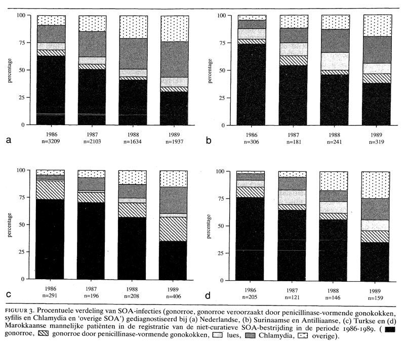Figuur 3 toont het vóórkomen van SOA bij mannen uit de verschillende bevolkingsgroepen. De vrouwen werden hier buiten beschouwing gelaten vanwege het kleine aantal allochtone vrouwen in het bestand. Bij allochtone mannen bleek relatief veel gonorroe voor te komen. Opvallend was verder de toename van het al relatief grote aandeel van gonorroe door penicillinase-vormende gonokokken bij Turkse en Marokkaanse mannen. Het SOA-patroon bij Surinaamse en Antilliaanse mannen lijkt meer op dat van de Nederlandse mannen. In samenhang met het voorgaande nam het aandeel van gonorroe bij alle bevolkingsgroepen af.