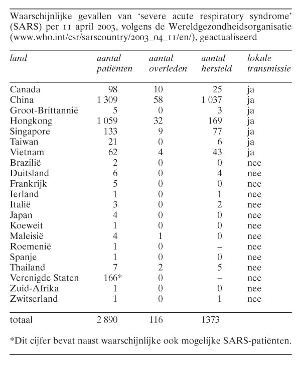 Het aantal gerapporteerde, waarschijnlijke gevallen van SARS bedroeg op 11 april 2890, waarvan 116 (4) met dodelijke afloop (tabel). Zowel in Hongkong als in Canada traden vrijwel alle sterfgevallen op bij mensen ouder dan 70 jaar…