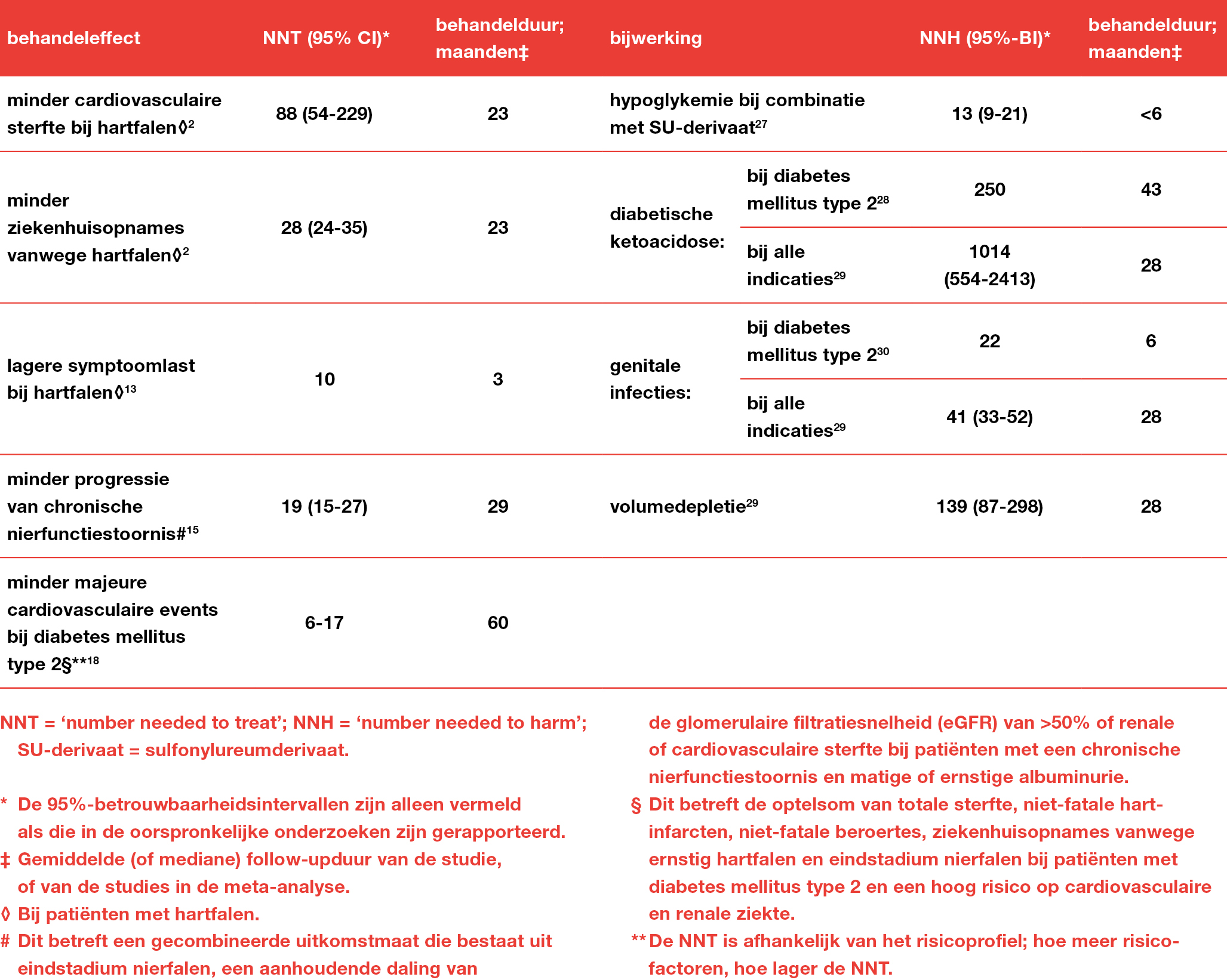 Bij patiënten met diabetes mellitus type 2 en een hoog cardiovasculair risicoprofiel verlagen SGLT2-remmers het risico op een gecombineerde uitkomstmaat van majeure cardiovasculaire events (‘major adverse cardiovascular events’; MACE). Een meta-analyse liet zien dat afhankelijk van het cardiovasculaire risico 6-17 patiënten moeten worden behandeld gedurende 5 jaar om één event (mortaliteit, myocardinfarct, beroerte, ziekenhuisopnames voor ernstig hartfalen of eindstadium nierfalen) te voorkomen.18 Het verhoogde cardiovasculaire risico van de onderzochte patiënten varieerde van de aanwezigheid van een enkele risicofactor tot de combinatie van hart- en vaatziekten en chronische nierfunctiestoornissen.