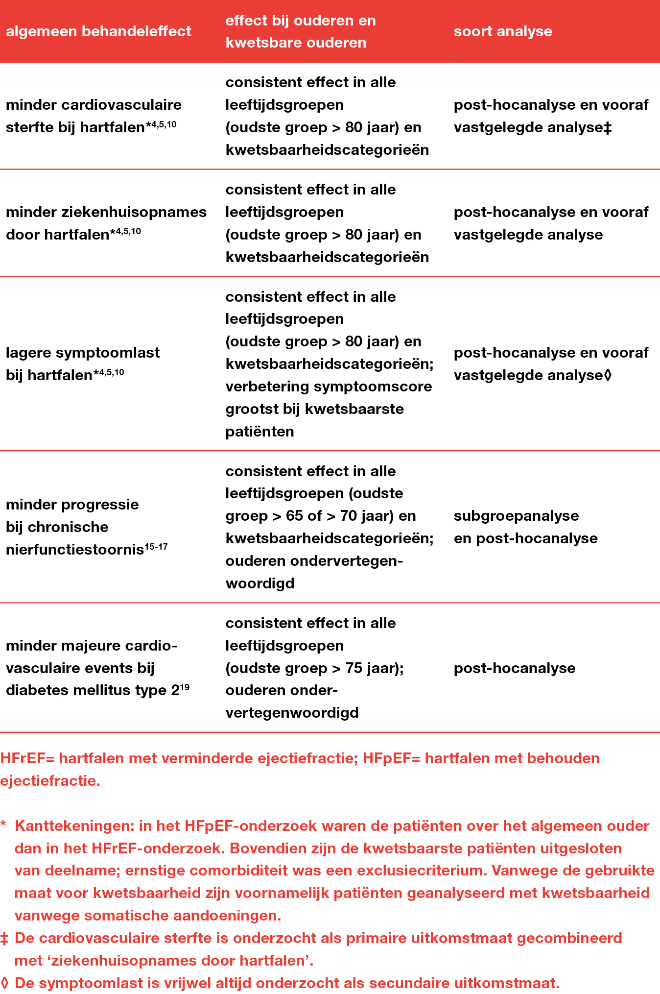 Voor de leeftijdsanalyses is het relevant te vermelden dat in de HFrEF-studies het percentage 75-plussers minder dan een derde (24-27%) van de totale onderzoekspopulatie is; bij HFpEF is dat bijna de helft (41-43% van de circa 6000 patiënten in de studies). Hoewel patiënten met ernstige comorbiditeiten werden uitgesloten, zijn HFpEF-studies over het algemeen beter te extrapoleren naar kwetsbare ouderen. Dit heeft te maken met het feit dat HFpEF sterk samenhangt met een hogere leeftijd en comorbiditeiten als diabetes mellitus type 2 en atriumfibrilleren. Vanwege de multifactoriële pathofysiologie wordt HFpEF zelfs beschouwd als een geriatrisch syndroom.3