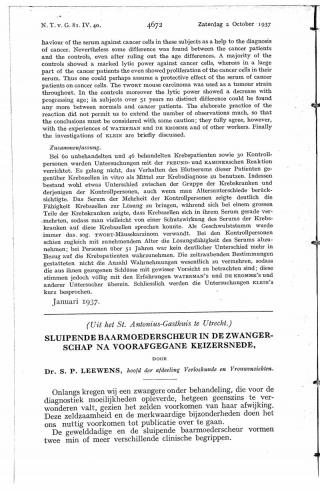 Dit artikel is alleen beschikbaar als PDF.Lees de PDF Artikelinformatie Online verschenen op 30 september 1937 Citeer dit artikel als Ned Tijdschr Geneeskd. 1937;81:4672-7 Heb je nog vragen na het lezen van dit artikel? Check onze AI-tool en verbaas je over de antwoorden. ASK NTVG Ook interessant Casuïstiek Baarmoederscheuring Nieuws Baarmoederverscheuring na cervicale keizersnede Nieuws Baarmoederscheur tengevolge van pituitrine-toediening Meer gerelateerd … Reacties Login om een reactie te plaatsen