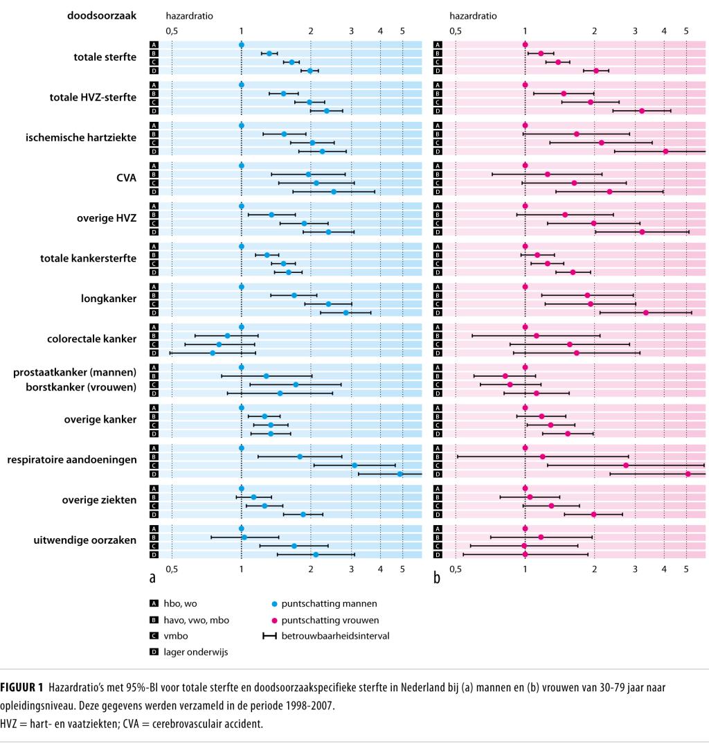 Het risico op overlijden was ongeveer 2 keer groter onder laagopgeleide mannen en vrouwen dan onder hun hoogopgeleide tegenhangers. De omvang van de ongelijkheden in sterfte was vergelijkbaar met die in andere landen in Noordwest-Europa, maar de ongelijkheid in sterfte aan longkanker was in Nederland aanzienlijk groter, vooral onder mannen.