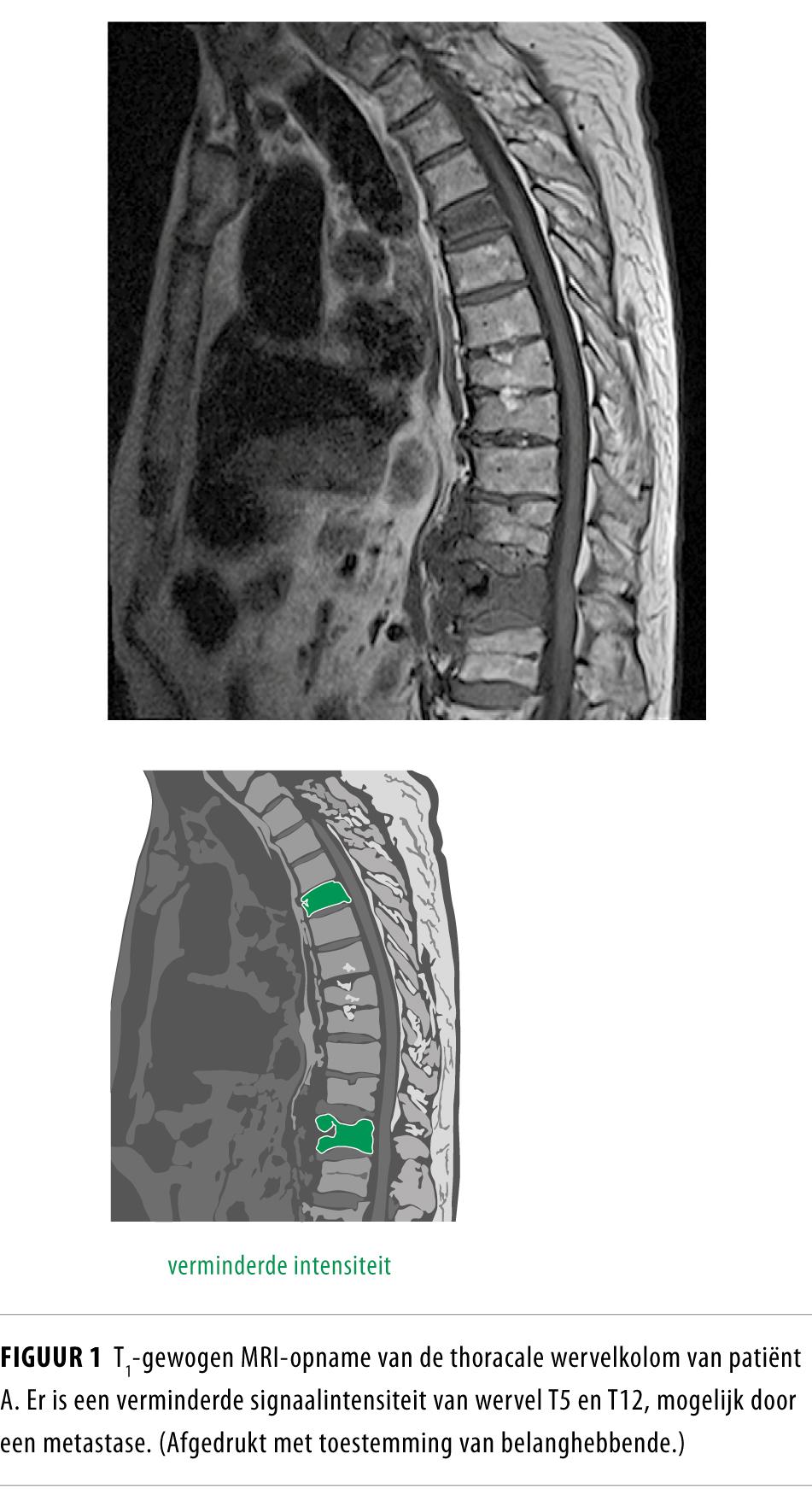 Een week na ontslag werd hij vanwege deze klachten opgenomen op de afdeling Geriatrie. Bij opname was er sprake van kloppijn over de onderste thoracale wervel, verminderde sensibiliteit in het rijbroekgebied, en levendige reflexen, verminderde kracht en voetzoolreflexen volgens Babinski aan beide benen. Het laboratoriumonderzoek toonde een CRP-concentratie van 110 mg/l en een leukocytenaantal van 13,6 x 109/l. Op de MRI-scan van de wervelkolom zag de radioloog een inzakking van de 5e thoracale wervel met tekenen van werveloedeem, mogelijk door een wervelmetastase, een mogelijke metastase van de 12e thoracale wervel en 2 bekende lumbale wervelinzakkingen (figuur 1).