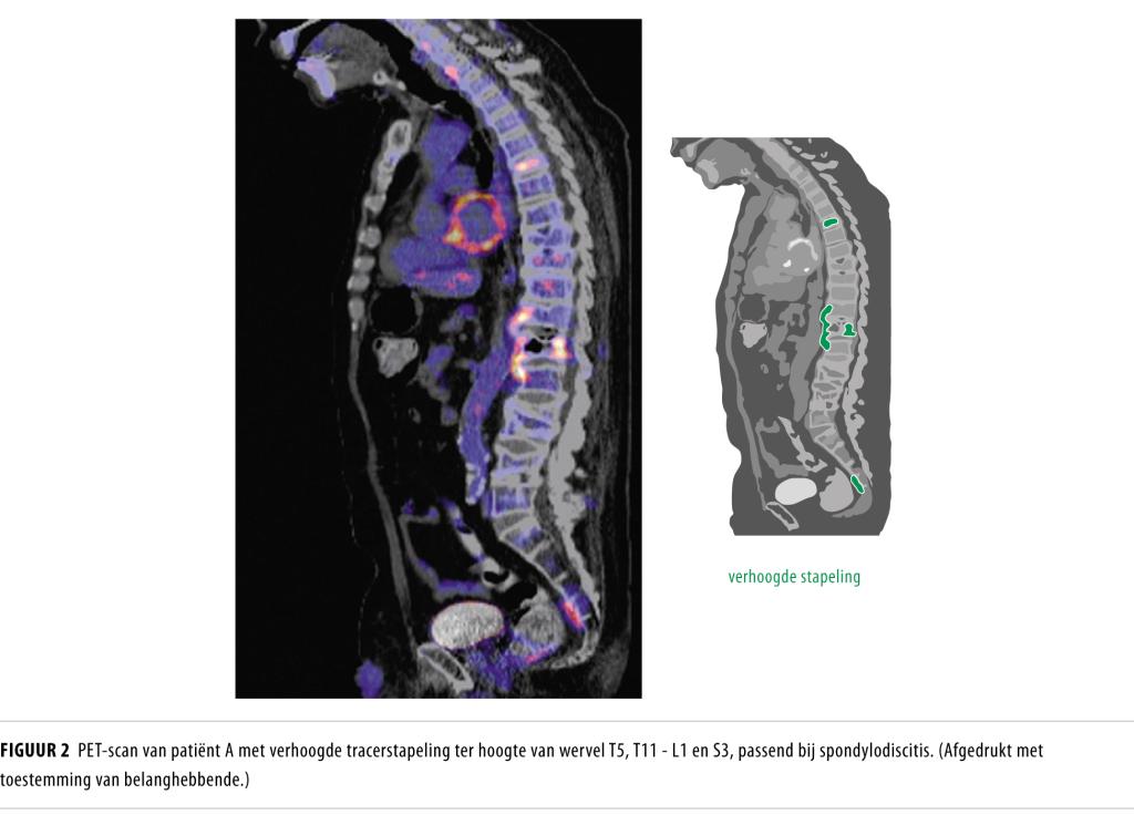 De casus van patiënt kwam ook aan de orde tijdens de oncologiebespreking, waar het sterke vermoeden werd uitgesproken dat patiënt wervelmetastasering had met een bijkomende infectie anders dan spondylodiscitis. Het antibioticum werd vervolgens gestaakt, waarna de ontstekingswaarden weer stegen en de rugpijn toenam. Op zoek naar een eventuele primaire tumor werd een FDG-PET-CT-scan verricht. Hierop zagen wij een beeld dat paste bij spondylodiscitis op meerdere wervelniveaus (T5-T6, T11-L1 en S2-S3) (figuur 2). De bloedkweken, afgenomen vóór aanvang van de antibiotica, bleven negatief.