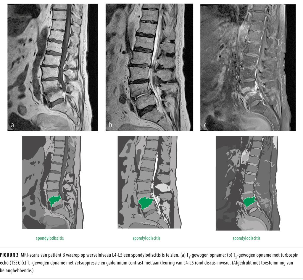 Vanwege het klinisch beeld met verhoogde ontstekingswaarden zonder ander focus, dachten we echter ook aan spondylodiscitis. Daarom kreeg patiënt cefuroxim 750 mg 3dd intraveneus voorgeschreven. Na 2 dagen daalden de ontstekingswaarden en na een week nam de rugpijn af.