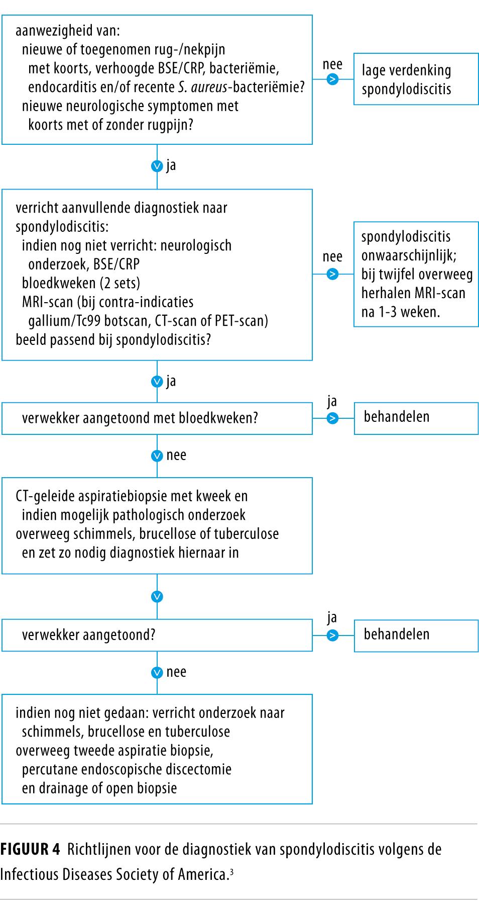 Tot voor kort ontbraken nationale en internationale richtlijnen voor de diagnostiek en behandeling van patiënten met spondylodiscitis. Recent heeft de Infectious Diseases Society of America (IDSA) een richtlijn gepubliceerd (figuur 4).3 Deze adviezen zijn echter niet specifiek voor ouderen. Bij negatieve bloedkweken adviseert de IDSA-richtlijn een biopsie te verrichten op geleide van CT-onderzoek.3 Bij kwetsbare ouderen wordt dergelijke invasieve diagnostiek vaak als een bezwaar gezien. Een biopsie is belastend voor de patiënt en brengt een klein risico met zich mee op bloedingen of schade aan omliggende structuren. De keuze voor invasieve diagnostiek dient af te hangen van de verwachte prognose en de belastbaarheid van patiënt.