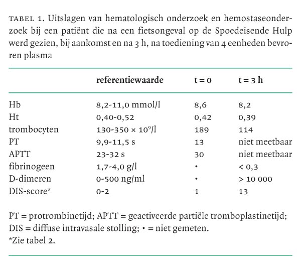 Een 72-jarige man, zonder relevante medische voorgeschiedenis of medicatie, was als fietser betrokken bij een ongeval met een andere fietser, waarbij hij op zijn achterhoofd was gevallen. Bij opvang op de Spoedeisende Eerste Hulp hadden de vitale parameters een niet-afwijkende uitslag en was de glasgowcomascore E2M5V2. Bij lichamelijk onderzoek werden een bloedende hoofdwond rechts pariëto-occipitaal en kleine schaafwonden op de linker elleboog en de rechter knie gezien. CT van de schedel toonde hemorragische contusiehaarden pariëto-occipitaal rechts en in minder mate frontaal links, met een geringe verschuiving van de structuren in de mediaan naar links. Er waren aanwijzingen voor een schedelbasisfractuur rechts occipitaal. Patiënt werd opgenomen op de Intensive Care en in verband met hevige onrust gesedeerd en beademd. Bij hem werd een intracraniële-drukschroef aangebracht, waarbij opviel dat er veel bloed via deze schroef naar buiten spoot. Hoewel de stollingswaarden bij opname niet afwijkend waren, bleken deze in zeer korte tijd te verslechteren (tabel 1). Patiënt bloedde tevens uit de punctieplaats van de subclaviakatheter, waarbij in eerste instantie gedacht werd aan een arteriële bloeding uit de A. subclavia. Tevens ontstond er een macroscopische hematurie. Vanwege toename van de intracraniële druk werd opnieuw CT verricht. Op de CT-kamer kreeg patiënt hypotensie en bradycardie, aanwijzingen voor een dreigende inklemming. Bij klinisch onderzoek bleek hij geen hersenstamreflexen meer te hebben. Hij werd klinisch hersendood verklaard en overleed circa 5 h na het ongeval. Bij schedelobductie werd een uitgebreide schedelbasisfractuur rechts occipitaal gevonden met tekenen van bloeding en druk op de hersenstam. Tevens werden 2 forse hematomen gezien, in de rechter regio pectoralis en rechts in de hals, en een brilhematoom van het rechter oog.
