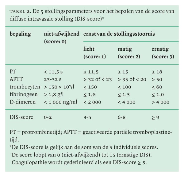De aanwezigheid en de ernst van de coagulopathie kunnen uitgedrukt worden in de vorm van een score van diffuse intravasale stolling (DIS): een samenvoeging van 5 frequent gebruikte stollingsparameters (tabel 2). Deze DIS-score is, naast de glasgowcomascore, een belangrijke voorspellende variabele voor de uitkomst van patiënten met een schedel-hersentrauma, zoals uit meerdere studies is gebleken.10-19