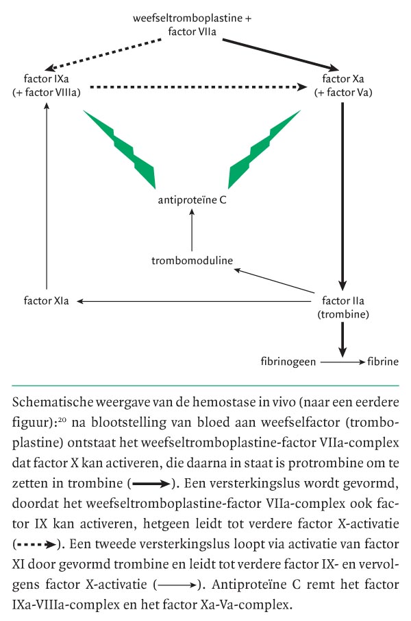 Recombinante factor VIIa (rFVIIa) is een veelbelovend hemostaticum.34 Na toediening in een adequate dosering leidt de supranormale farmacologische factor VIIa-concentratie tot een acute trombine-uitstoot, fibrinevorming en remming van de fibrinolyse. Voor de werking van rFVIIa is complexvorming met weefselfactor en fosfolipiden essentieel. Daardoor veroorzaakt rFVIIa primair lokaal hemostase op de plaats van de vaatwandbeschadiging, met theoretisch een geringere trombosekans dan bij gebruik van protrombineconcentraatcomplex. Mits opgewarmd tot > 35°C, en mits er geen acidose in het spel is, kan rFVIIa een belangrijk hulpmiddel zijn indien conventionele middelen falen, zoals recentelijk is aangetoond in een grote patiëntengroep met traumatische coagulopathie.35